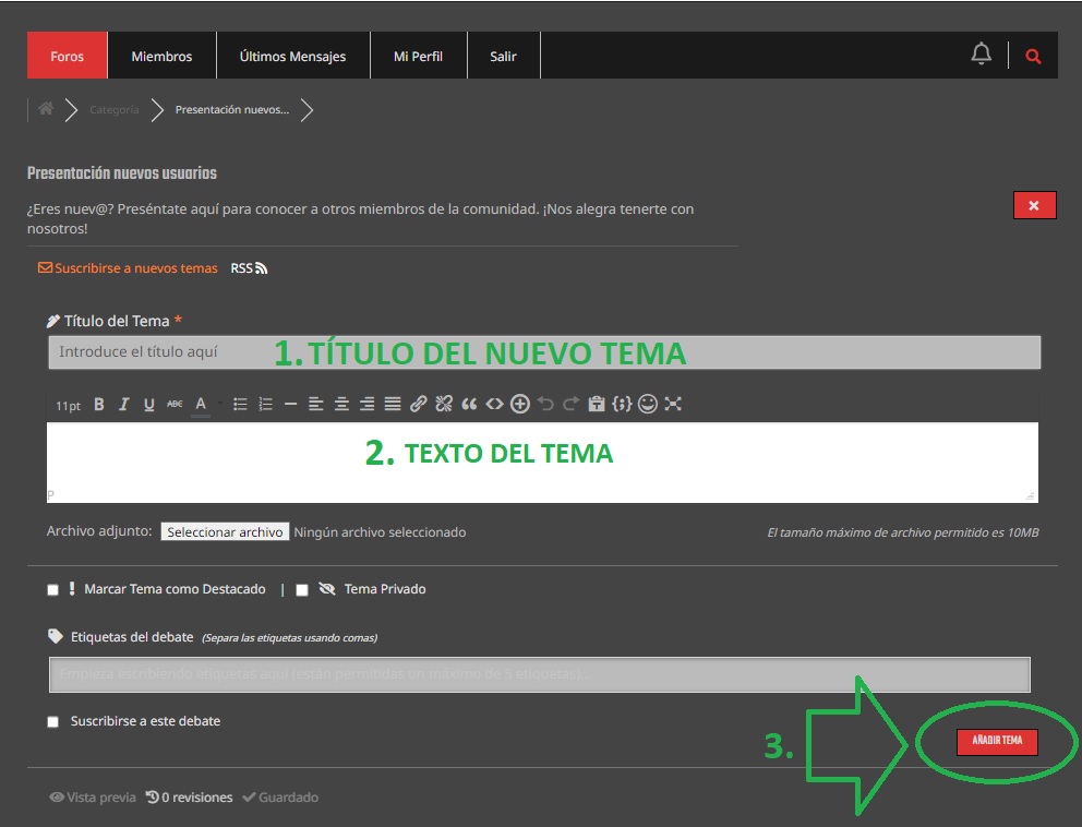- Cuando estés satisfecho con tu publicación, revisa los detalles y finalmente haz clic en el botón de "Añadir Tema" para que tu post se publique en el foro.